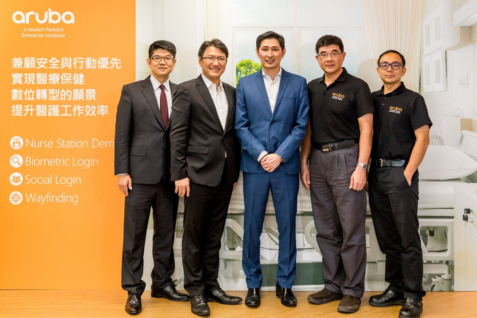 圖說:Aruba (Hewlett Packard Enterprise 子公司)於今日(12)舉辦媒體茶敘,會中東南亞及台灣區資深總監暨總經理Justin Chiah(中)與台灣及東協地區總經理許佳樹(左二)、台灣區副總經理蔡政修(左一)、資深技術經理陳清淵(右二)、技術經理黃士誠(右一),分享2017年穩健成長的業務以及2018年的營運策略,同時展示智慧旅館以及智慧醫療的相關應用。
