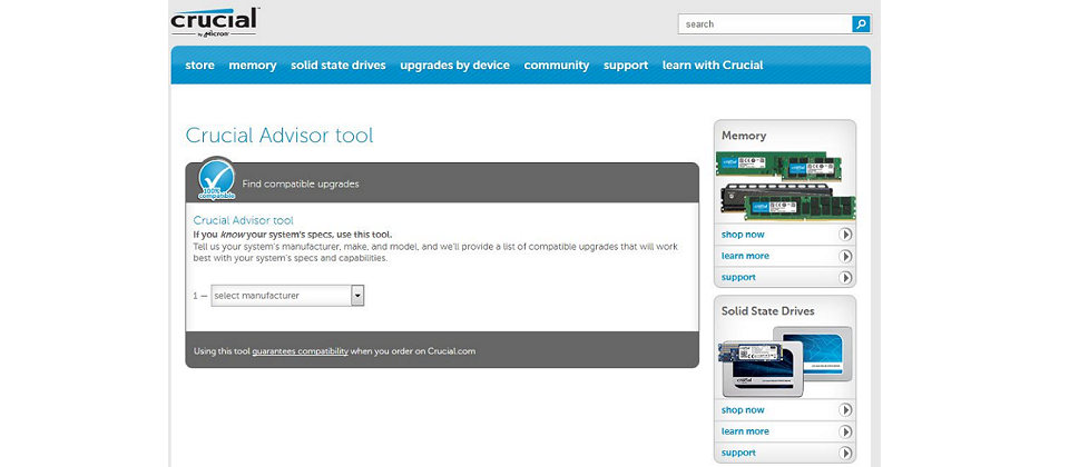 升級記憶體與SSD看似很難,但其實非常簡單,即使完全沒有電腦技術背景的人也能輕鬆完成,首先最重要的是,找到與您的PC和筆記型電腦的系統相容的升級產品。大部分的人都會直接到所使用的電腦系統製造商網站尋找相容的升級產品,但往往可能因所使用的系統過舊難以查詢,或是相容的產品已無法取得,導致您需要花費更多心力與時間搜尋文章或電話諮詢。您可以免費使用Crucial Advisor Tool為您的系統找到相容的記憶體與SSD,Crucial Advisor Tool能夠幫您省下網路搜尋文章與發問的時間成本,目前已有超過2500萬人次使用,且不須1分鐘的時間就能從10萬種系統中(幾乎是所有系統)找到相容的記憶體與SSD,只要跟著以下步驟輸入資訊,就能輕鬆找到所需產品: