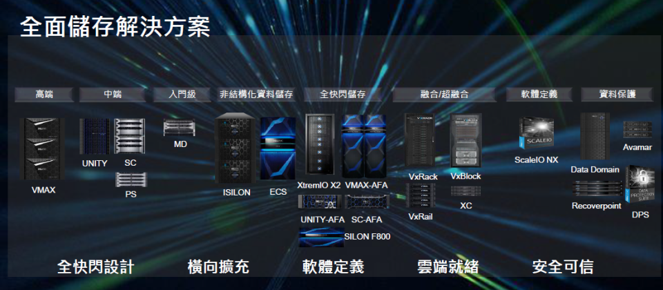 鑑於儲存設備扮演的角色日益吃重,Dell EMC 新世代儲存產品線是朝全快閃設計、橫向擴充、軟體定義、雲端就緒、安全可信等五大面向發展,訴求在滿足大量資料儲存時,也能支撐企業數位化過程中的各種關鍵技術,堪稱是市面上技術最先進、最齊全的儲存設備解決方案。