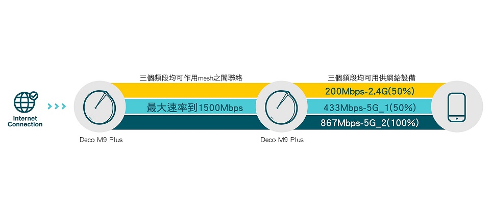此外,因為數據傳輸的過程,以一次來回才能完成一次交流,現在的Mesh Wi-Fi基本上都有備援回程功能,舉Deco M9 Plus為例,就是透過2.4GHz和兩個5GHz頻段傳輸數據,且是全面開啟三個頻道,注意,M9 Plus是當網路塞車的時候,才會開啟備援回程網路,就像車流量大時,有些路段會調撥車道,車道越多,塞車的情況就越能獲得緩解;然而,這還是有區別的,市面上許多Mesh路由器還是只能供應1個頻段作為回程網路(5G專用通道),這還是可能導致網路塞車的問題,購買前一定要了解產品的特性,才不會花冤枉錢!