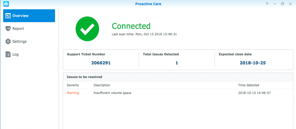 Synology 開發領先業界的自動偵測套件 Synology Proactive Care,旨在減少因系統異常而導致重大問題產生之風險。Synology Proactive Care 套件提供 7x24 的系統與硬體監測,隨時掌握系統狀態,且在偵測到異常狀況時自動寄發通知給使用者,並提供初步排除故障步驟及建立技術支援單。同時,Premium Service 團隊也會依據問題嚴重性,主動聯繫使用者。
