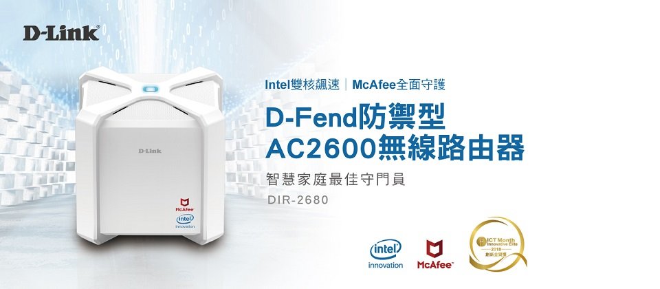 【2018/12/18 台北訊】全球網通領導品牌D-Link友訊科技今日宣佈全新智慧家庭資安無線路由器「D-Fend防禦型AC2600路由器DIR-2680」正式在台上市,DIR-2680雙頻Gigabit 無線路由器是由D-Link策略聯盟全球防毒軟體大廠McAfee、和晶片龍頭Intel跨界三強的攜手合作,提供消費者最高網路安全規格的家用連網裝置。D-Link首款搭載Intel® GRX350 1.6GHz CPU雙核心處理器 的DIR-2680,不但提供卓越快速的無線網路傳輸效能更搭配AnyWAN™ SoC晶片,透過軟體方式便能提升安全功能。