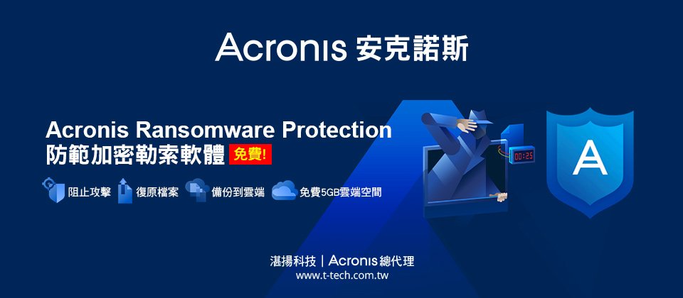 安克諾斯Acronis暖春獻禮贈送企業用戶防加密勒索工具活動,詳情請參閱https://www.t-tech.com.tw/acronis_ransomware_protection_free.php 更多關於安克諾斯產品資訊,請洽總代理湛揚科技(02)2735-3512。