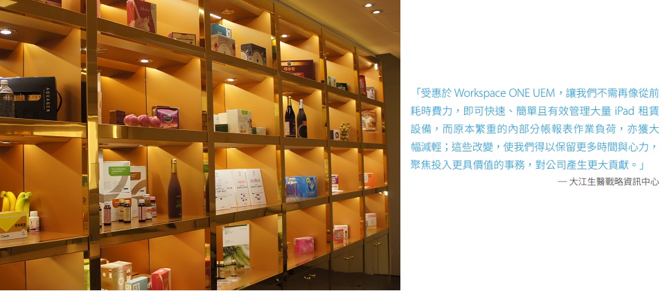 A:大江經營者考量員工遍佈各洲、業務範圍涵蓋全球數十國,為了方 便管理各地區人、事、物動態,同時也加速同仁作業效率,因而設計 一套線上作業流程,強調不論報價、接單、簡報、研發甚或工廠管理 等關鍵事務,皆可透過 Apple iPad 搭配 TCI App 順暢執行。 正因如此,Apple iPad 對於大江的業務、研發乃至工廠等同仁,形 同不可或缺的標準配備,用量愈來愈大。負責掌理 IT 管理事務的戰略 資訊中心,深覺初期透過買斷方式購置 iPad,在管理上相當不便,例 如同仁利用自身 Apple ID 綁定服務,當離職繳回設備後,接手的使用 者還是被要求輸入原有 Apple ID,難以有效解除。 於是在去年(2018) 期間,大江生醫戰略資訊中心決定採用大 綜電腦提供的 iPad 兩年租賃服務,前後共計引進 200 餘臺 iPad, 也透過租賃合約一併引進行動裝置管理(MDM)平臺「VMware Workspace ONE 統一端點管理(UEM)」,它不僅提供多語系管理 介面,更有助 IT 人員快速掌握所有 iPad 租賃的使用狀態、執行統一 發佈與更新,亦可強制解除離職員工的 Apple ID 綁定關係,讓種種 管理、分帳難題消弭於無形。