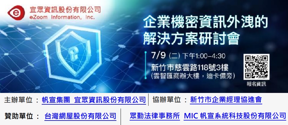 2018年是全球歷史上資料外洩最嚴重的一年,而2019年將會更加嚴重與明顯。對企業而言,資訊安全威 脅不但可能造成資料外洩,導致商業機密流出,影響企業競爭力,還可能造成商譽受損,衍生交易糾紛, 影響企業運作。 為此,宜眾資訊邀請了資安法令、調查案例、企業管理及資安管控等領域的專家,由不同層面的資安事例 經驗分享,如由眾勤法律事務所柯律師分享資安法令相關糾紛案例、KPMG 安侯企業管理郭協理分享如 何落實法令面的資安管控、法務部調查局劉檢察官分享經濟犯罪案例及由帆宣系統科技-宜眾資訊分享資 訊安全相關事例,進而反思公司內部機密資料的管理是否完備、妥當。一起探討如何有效地預防資料外洩 與不幸資料外洩後之對應與採證措施。 本次活動免費報名,敬邀您參與本次盛大陣容所帶來的實務經驗分享!!