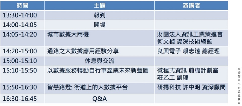 本次交流會特邀良興電子總經理賴志達、微程式資訊副理莊乙工,及研揚科技資深顧問許中明等專家依序分享通路、自行車、智慧路燈等不同領域的資料加值應用。此外,資策會的何文楨何總監,亦於會中為各位介紹城市數據交換平台的內涵。