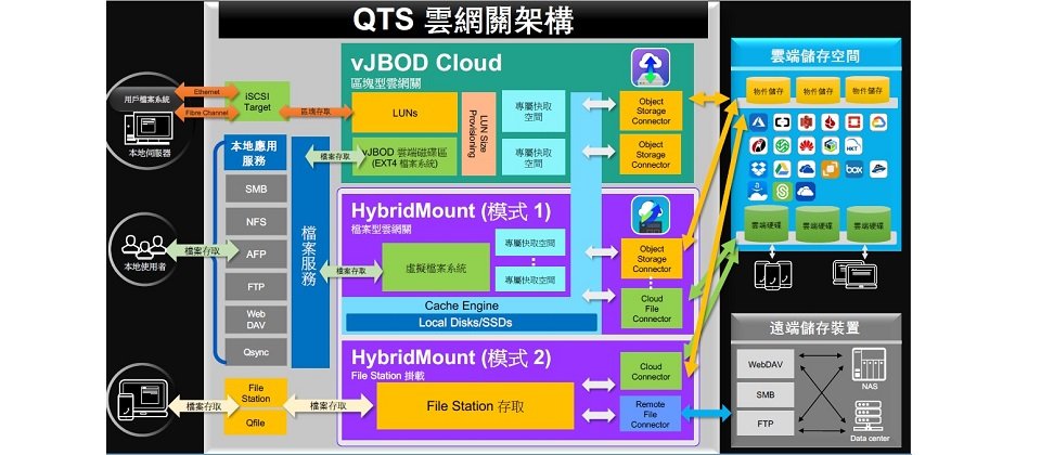 雲端儲存資源是目前許多企業強化資料管理的首選,透過QNAP HybridMount雲端閘道器與vJBOD Cloud搭配NAS系統,企業能讓雲端資源與內部系統無縫接軌,有效串接本地與雲端上的雲端資源,讓資料保存與管理更加安全有效率。