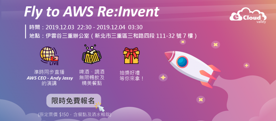 「Fly to re:Invent!」活動資訊詳見報名網址:https://www.ecloudvalley.com/zh-hant/fly-to-reinvent-2019/