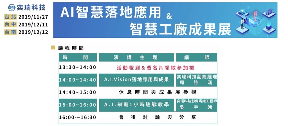 當大家的 A.I 應用還著重在人臉辨識跟車牌辨識的應用時,奕瑞科技已經默默地深耕與許多電子業、製造業的客戶們共同努力,開發許多實際應用在生產環境及管理的 AI 視覺辨識應用,不管是在物流、工安、智慧倉儲、還是產品檢測,奕瑞科技希望將藉由這次交流的機會,於12/11台中場、12/12台南場活動,與大家無私的分享。