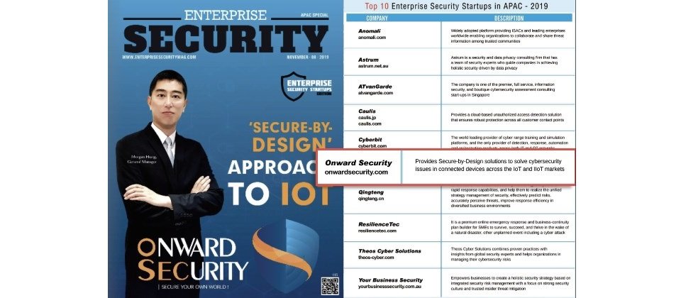 物聯網系統開發與整合即存在資安漏洞,導致安全防護難度提高;全球駭客虎視眈眈,猛攻家庭物聯網、植入式醫療裝置、汽車等高安全威脅商品,勒索高額金錢。因此各國政府積極建立、推動資安法規,進而帶動資安市場蓬勃發展。有鑑於亞太地區資安市場與資安新創能量的快速成長,北美權威安全媒體(Enterprise Security Magazine)從創新技術解決方案、區域影響力等面向,於百家亞太地區資安相關新創公司,選出亞太區10大資安新創企業。安華聯網(Onward Security)從 「Secure by Design」概念出發,以IoT與IIoT之整體解決方案獲得青睞,為臺灣唯一入榜並獲特刊獨家專訪(Top 10 Enterprise Security Startups in APAC)之新創企業,並與以色列Cyberbit、澳洲、日本、新加坡等優質企業並列此主題之10大亞太地區新創公司,足見安華聯網對物聯網資訊安全的努力與成果深獲國際肯定。