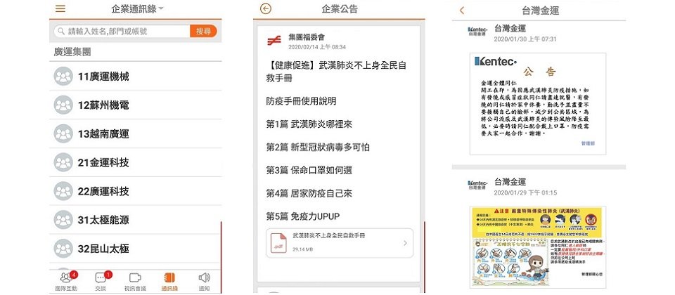 在疫情爆發後,相關部門立即接獲上層指示,按照相關單位所發的訊息進行公司決策布達的公告,過去需透過互助組的電話連絡方式進行通知,現在只需透過team+,將公告傳訊給每位同仁,不僅節省大量時間,更簡化通報流程。此外,人資單位利用公告功能統一發布公司停工訊息、疫情期間薪資發放原則,以及後續的復工管理辦法等,各項因應疫情的機動調整與政策布達,讓分散在大陸不同省分及廠區的同仁,都能同步即時接收公司重要訊息,了解公司因應疫情相關運作程序,拉高同仁派駐海外的各項防疫層級,大幅增加溝通效率並減少溝通成本。