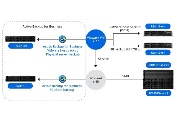 台灣資生堂自員工PC受勒索病毒感染後便開始尋找合適的備份方案,除了員工PC,也希望能將虛擬機、Windows伺服器等平台上資料一併妥善保護,但市面上的備份軟體不僅費用高昂,也無法滿足跨平台備份的需求。導入Active Backup for Business後,IT人員可以透過單一介面一次集中部署、監控45台PC、2台伺服器、77台虛擬機的備份任務,幫助台灣資生堂集中管理多個平台的備份任務,共 64.5 TB的資料量。