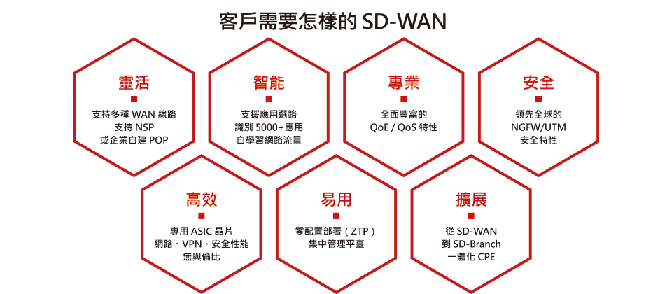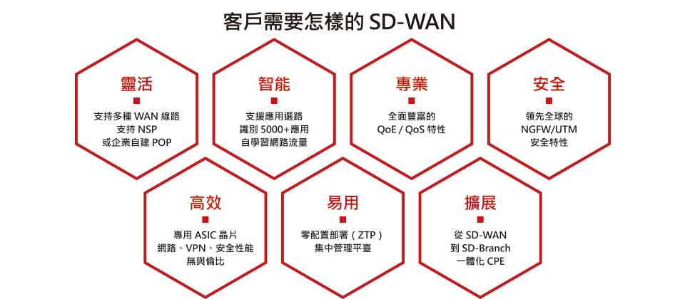 目前市面上有著各類廠商從不同角度開發SD-WAN服務,使得SD-WAN存在著許多不同定義,但不外乎都在強調產品對於企業多點分支機構有易於部署、中央集中控管及降低成本的優勢,以高效能的廣域網路取代昂貴的私有廣域網路,像是MPLS (Multi-Protocol Label Switching, 多重通訊協定標籤交換傳輸),進而特別廣受擁有大量分支機構的零售商和金融機構採用。SD-WAN非全新的概念,對許多人而言也猶如老生常談的話題,但是當我們試著去思考,若就因為SD-WAN分配著MPLS、寬頻及LTE等多種類型的線路平衡連接,而將SD-WAN的技術和過往平衡線路的技術視為同個領域,那麼過去那些專門的廠商就不會遭淘汰, 另外,2016年之後,Gartner不再發佈ADC和WAN OPT 的魔力象限,也可說明市場對舊技術的不再看好。事實上,傳統的線路負載平衡設備能做線路負載平衡,但是做不到應用識別及雲端服務導向,無法基於應用或服務選路,而廣域網路最佳化則著重於四層TCP / IP進行優化;一般NGFW和上網行為管理產品,能做應用識別和基於應用選路,甚至是可以健康狀態檢測,但是不能做任何改變應用所需線路健康值的動態雙向調整(高級ADC功能)。因此,如何整合上述技術,包括可以靈活支援多種WAN線路、具備智能識別應用,並且達到高效、易用,專業的QoE/QoS特性、容易擴展又不失安全性的SD-WAN,將會是企業關鍵資訊基礎首重因應之道。