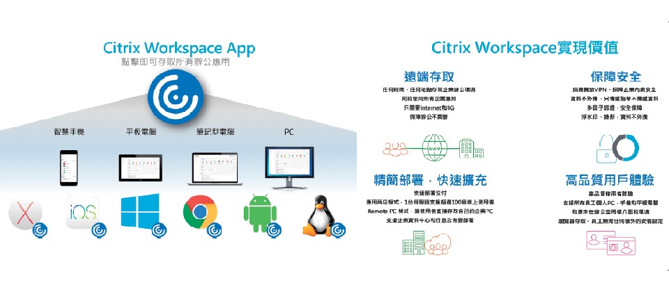 一場突如其來的疫情改變了人們的生活和工作。為了有效防控疫情,在家辦公、上課成為主要工作與求學方式。在這種情況下,協同辦公、視頻會議等需求迅速增長。Citrix Workspace是一個統一、安全、智能的工作平台,通過組織、指導和自動執行高效工作所需的活動來改善使用者體驗。此外 Citrix Workspace藉由集中式架構統一儲存作業系統、應用程式、個人設定檔等資料,可根據不同需求,組合搭配作業系統與執行軟體,有效避免軟體與作業系統相容性問題,有助簡化雲端電腦教室管理作業。另在資安層面,可透過虛擬機器的管理介面,控管前端使用者存取的檔案,進一步杜絕危害檔案蔓延。