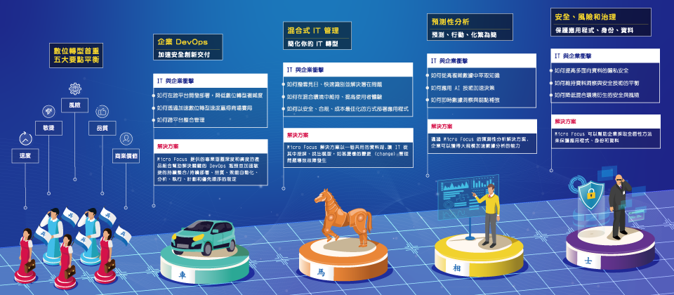 為了不斷發展並在競爭激烈的環境中保持價值和競爭力,數位轉型已成為現代企業必不可少的重要計畫,但是數位創新的複雜性、速度、成本和動態性,可能會讓企業不知所措。IDC 在其最近發表的白皮書《運用 Micro Focus 實現端到端數位轉型》1 中,建議企業針對數位轉型的四個關鍵支柱所帶來的挑戰,並善用 Micro Focus 的優越技術和能力,平衡轉型過程中的速度、敏捷性、風險、品質和商業價值,達成真正的全方位數位轉型目標。