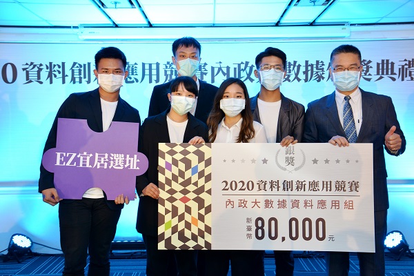 本屆2020資料創新應用競賽內政大數據資料應用組競爭可謂相當激烈,最後僅有8隊獲選進入決賽。本此獲得金獎榮耀的是「社會共享家」,團隊成員發現在現行政策要求下,雖然促使企業施行 CSR 來推動弱勢家庭和身障者重返職場,可惜至今成效不彰,也往往淪為公關操作。為此,團隊採用供應鏈架構結合區塊鏈技術,除在確保個資和企業隱私性的前提下,運用開放資料與企業系統之間的結合,讓企業資源將能進入政府政策循環中,進而提供有價值的服務。