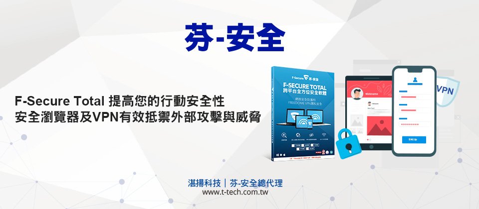「F-Secure TOTAL芬-安全跨平台全方位安全軟體」全面防護您的個人資訊與隱私安全。更多資訊請參閱芬-安全總代理湛揚科技www.t-tech.com.tw ,或洽芬-安全網路授權經銷商—泰騰恩商城、PChome、MOMO、Yahoo、UDN等網路商城熱烈販售中!