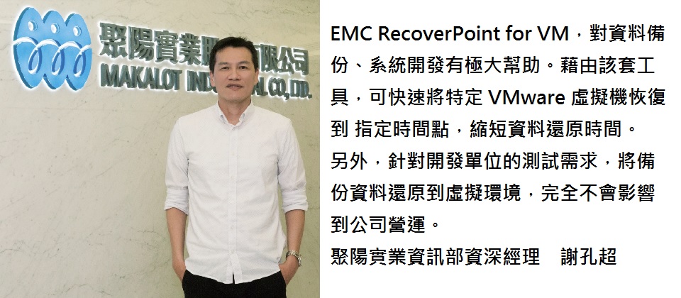 RecoverPoint for VM,更對我們資料備份、系統開發有極大幫助。藉由該套工具,我們可快速將特定 VMware 虛擬機恢復到指定時間點,縮短資料還原時間。另外,亦可能針對開發單位的測試需求,將備份資料還原到虛擬環境,完全不會影響到公司營運,這是非常棒且實用的附加功能。