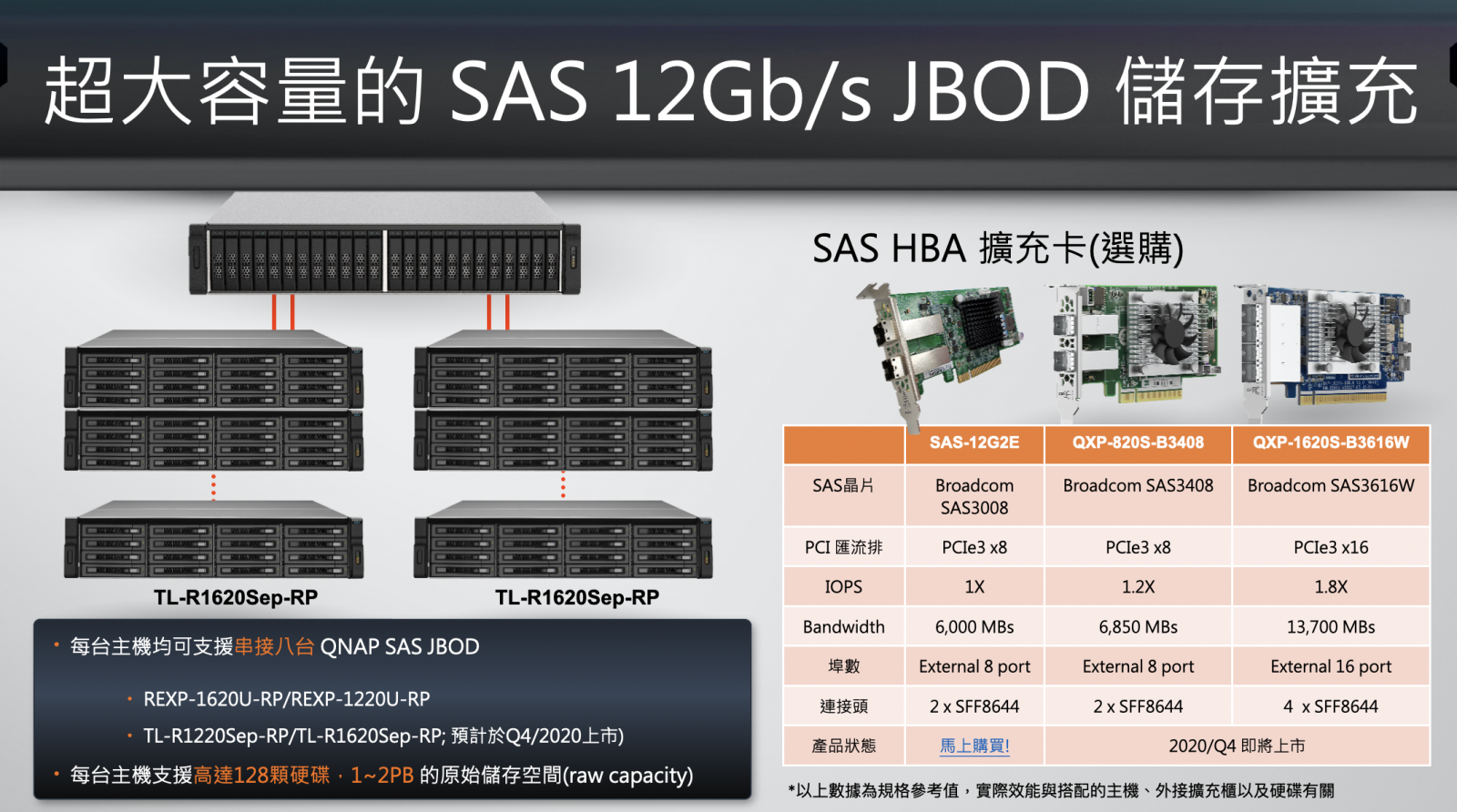 因應數位資料成長需求,企業只要在QNAP TS-h2490FU 中安裝QNAP SAS HBA擴充卡,最多將可串接八台QNAP SAS JBOD設備,整體儲存空間最高可達2PB。