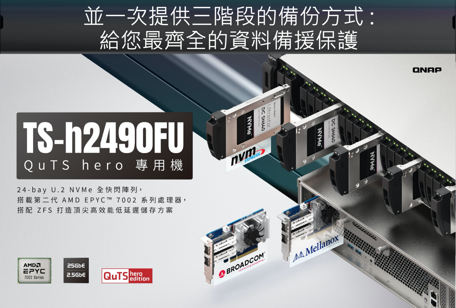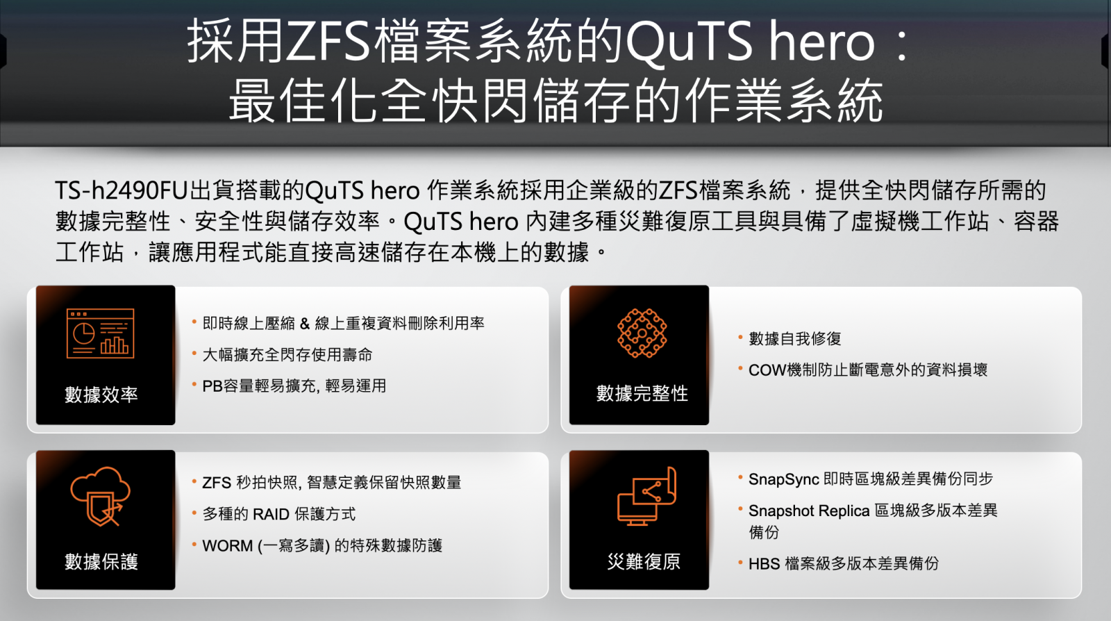 這款主打高階應用的QNAP TS-h2490FU企業級儲存設備,作業系統使用QNAP自行研發的QuTS hero,採用為企業級應用設計的ZFS檔案系統,可滿足全快閃儲存設備所需的資料完整性、安全性與儲存效率等需求。在兼顧效能、企業需求下,QuTS hero作業系統內建多種資料保護工具,能滿足不同應用程式存取與分析需求,如AI、主機虛擬化、桌面虛擬化等應用,同時提高資料的可靠度。