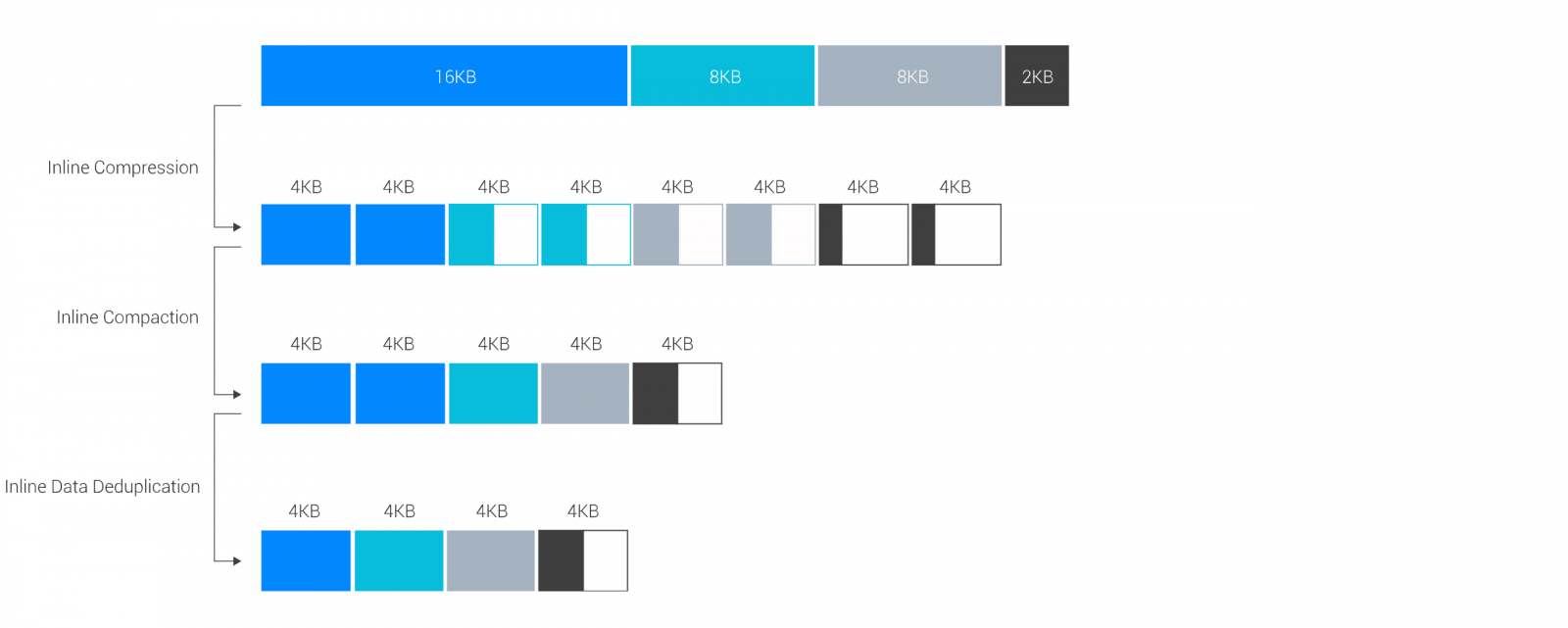 ZFS 檔案系統備受企業肯定的原因,在於內建即時重複數據刪除與即時壓縮功能,可透過事前資料減量方式,達到大幅減少 SSD 寫入次數,以提升全快閃儲存設備能大幅提高SSD整體使用壽命的目的。其次,QuTS hero 作業系統也採用 QNAP 研發的寫入聚合 (Write Coalescing) 演算法,可將零散而隨機寫入的資料進行循序整理,並合併寫入區塊之中,同樣可達到減少 I/O 數量、延長SSD使用壽命,來減少隨機寫入次數,以呈現更佳的存取效果。
