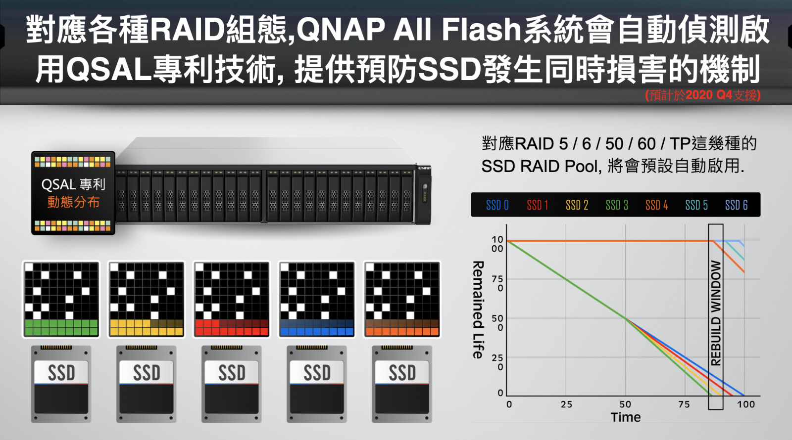 在前述多種資料保護功能之外,QNAP也針對全快閃儲存架構的特性,自行開發出QSAL專利技術,會將資料與超額配置動態分散到所有快閃磁碟上,能避免發生多台SSD同時故障的憾事,讓企業能安心享受QNAP TS-h2490FU的高效能與低延遲。