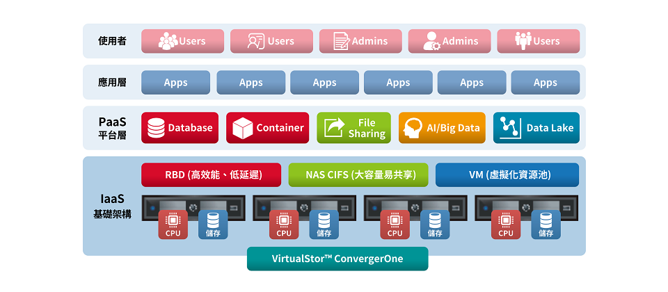 VirtualStor™ ConvergerOne搭載運行各種企業應用所需的虛擬化功能,適合企業運行各式服務應用或作為搭建私有雲基礎架構,也可以搭載應用程式,作為ISV(獨立開發軟體開發商)的軟硬體整體解決方案。其中最大優勢為,將資料中心最關鍵的運算及儲存資源做整合,提供能簡易管理配置運算和儲存資源的統一管理平台,並能在單一Web介面的管理平台中呈現目前集群裡的各項資源使用情況及其健康狀態。