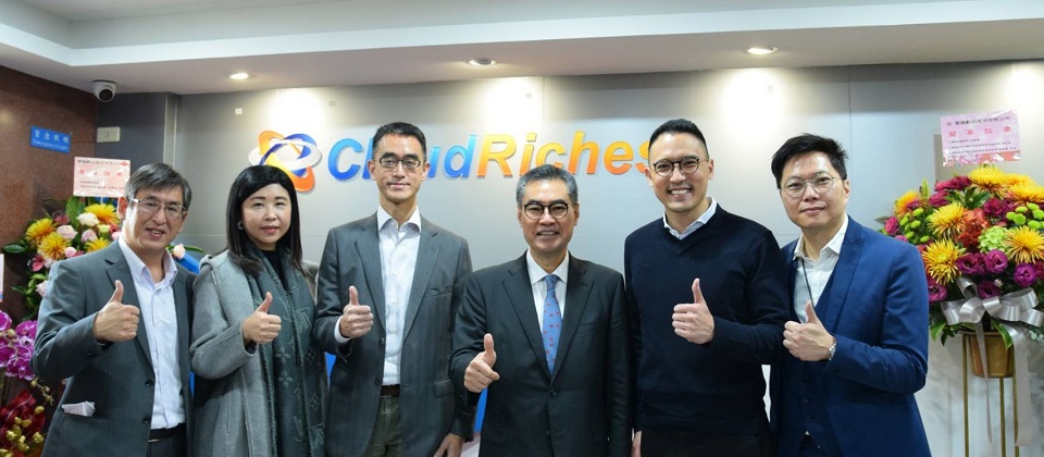 雲馥數位新辦公室開幕揭幕儀式合影 : 雲馥團隊與台灣微軟總經理 孫基康與美商甲骨文台灣分公司總經理 張永慶合影