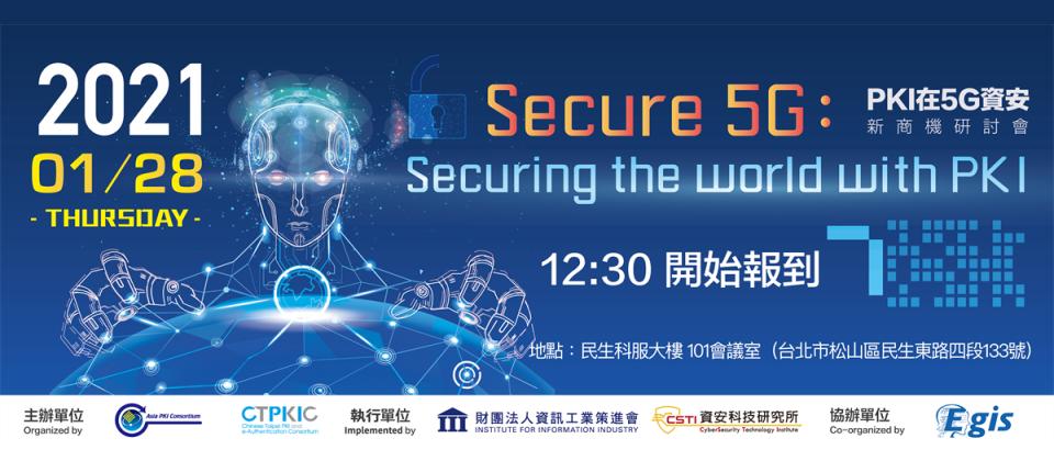 由亞洲PKI聯盟(APKIC)主辦,資策會資安所執行,神盾股份有限公司協辦的Secure 5G: Securing the world with PKI《PKI在5G資安新商機研討會》,茲訂於2021年1月28日,邀請5G相關廠商如電信業者、基站設備商、MEC廠商、垂直領域應用業者、系統整合廠商、PKI與資安廠商,以及亞洲各國先進,假民生科服大樓(台北市民生東路四段133號1樓),探討資安市場趨勢和身分認證關鍵技術,提供使用者簡單、迅速、安全的認證機制與環境。會中將有資策會資安所發表資策會2020年「PKI在5G資安應用之研究報告」,分享如何在5G資安中可有更多的PKI應用延伸,以及來毅數位科技、熵碼科技,及I.X.等公司將展現我國於PKI、電子認證在5G資安之強大研發能量,成熟之PKI技術在台灣驗證,更同步連線國際APKIC會員專家,零時差進行國際交流,零距離強化商業合作。