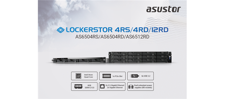 ASUSTOR Inc. 發表專業儲備雲系列 4/12 硬碟槽 1U/2U 機架式 NAS - AS6504RS (Lockerstor 4RS) 、AS6504RD (Lockerstor 4RD) 以及 AS6512RD (Lockerstor 12RD),搭載 Intel Atom 企業級四核心處理器及 8GB DDR4-2133 記憶體 (最大可擴充至 128GB, 32GB x4),提供穩定可靠的系統運作。AS6504RD 配置雙 Gigabit 與雙 2.5 Gigabit LAN 高速網路埠,維持穩定效能的同時,也提高了工作生產力。在 Samba 下的存取效能也能高達每秒讀取效能 591 MB/s,寫入 565 MB/s (2.5G x2 網路聚合 / RAID 5)。