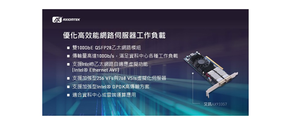 「由於現今網路伺服器及儲存設備需求更快的網路速度,因此我們推出全新配備雙100Gb/s QSFP28連接埠乙太網路模組AX93357,適合高密度應用,透過PCIe 4.0介面與第3代Intel® Xeon®雲端與邊緣運算平台NA870搭配使用,大幅加速傳輸並擴充資料中心的容量。此外,支援加強型Intel® DPDK高傳輸方案,為Intel®中央處理器提供程式設計框架,並加速開發高速數據分組網路應用程式;憑藉著創新與多功能提供更強大智慧和效能,大大地優化如網路功能虛擬化 (NFV)、儲存、高效能運算及人工智慧 (HPC-AI) 以及混合雲等高效能伺服器的工作負載。」艾訊網路運算平台產品企劃部經理吳玉霞表示。