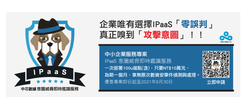 我們發現許多中小企業對於該如何選擇正確且安全的資安服務傷透腦筋。為此,中芯數據專為中小企業打造安全居家工作環境陪您共體時艱!中芯數據IPaaS服務除了會檢測全球情資及台灣獨有情資資料庫外,透過獨有的Intended Intrusion Hunting(IIH)技術,有別與以往資安設備只對單一行為進行偵測告警,IPaaS服務對於所部署的端點中任何可疑的行為,IIH機制會針對可疑行為的前後動作進行整合判斷,即便駭客利用系統或軟體漏洞進入內網,中芯數據IPaaS皆能立刻發現與立即通報,更提供詳細惡意程式資訊及完整的處置辦法,除了確保單位可以成功偵測到各種最新與未知的威脅之外,並可確保事件處理過程中,單位內業務服務都能正常運行不中斷。