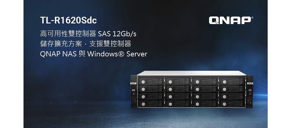 威聯通®科技 (QNAP® Systems, Inc.) 推出新款 TL-R1620Sdc 高可用性雙控制器 SAS 12Gb/s 儲存擴充設備,採用 3U 機箱設計,支援 SAS 12Gbps 傳輸介面、Broadcom® SAS DataBolt™ 線路頻寬優化技術,SAS 雙通道備援設計以及雙備援電源保護,確保系統穩定運行。TL-R1620Sdc 可擴充 QNAP 雙控制器 NAS 與 Windows® 雙控制器伺服器儲存空間,支援菊鏈串接多達 7 台,適合虛擬化應用儲存、監控影像儲存、巨量資料儲存或多媒體影像儲存等企業關鍵任務應用。