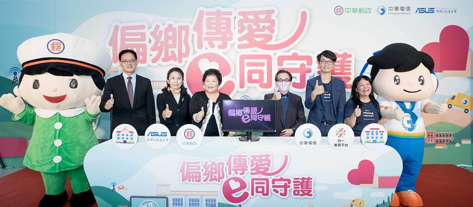 華碩文教基金會執行長魏杏娟、中華郵政副總經理郭純陽、中華電信副總經理張世忠與均一平台教育基金會執行長呂冠緯一同偏鄉傳愛、e同守護