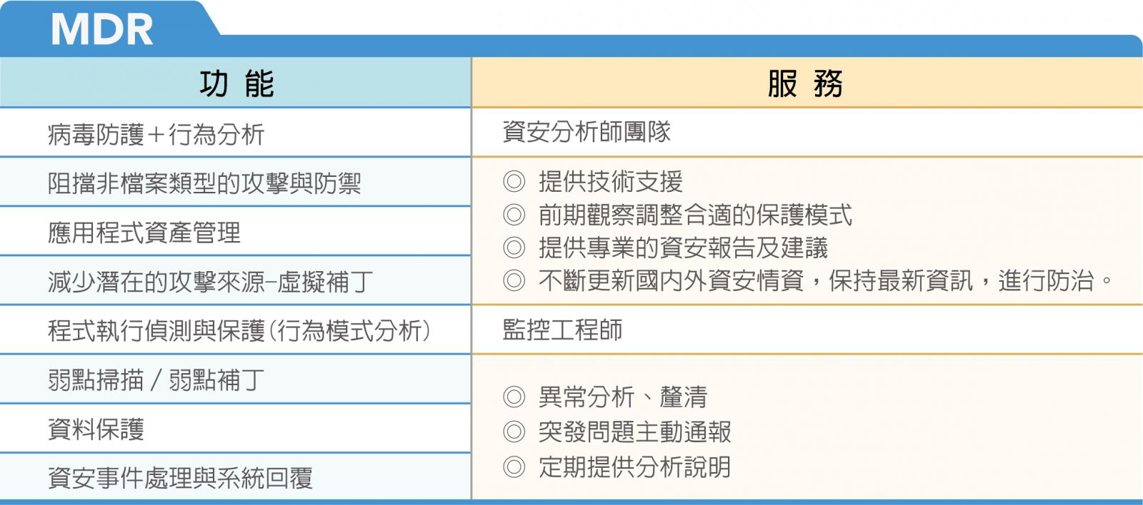 在惡意攻擊越來越常態化下,驅使越來越多企業有所省思,深知單憑在網路閘道佈下重兵防禦,已不足以抵擋駭客的侵襲,需將防護重心從閘道同時延生到端點,在既有的防毒軟體以外,佈建另一種更能有效防禦進階威脅、且更能藉由行為分析來還原攻擊事件脈絡的技術,因而使得不論是「端點偵測與回應」(EDR)、乃至於「託管式偵測及回應服務」(MDR),都逐漸成為近年企業評估與採購的重點項目。