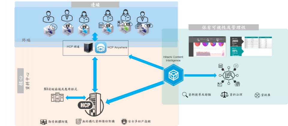 Hitachi Vantara的物件儲存解決方案日立內容平台(Hitachi Content Platform, HCP),透過整合的系列產品和不斷發展的獨立軟體廠商生態系統,提供了涵蓋邊緣/雲端/本地核心領域的整體解決方案: