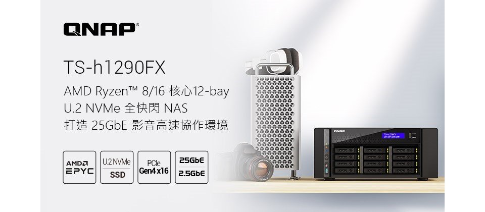 運算、網通及儲存解決方案創新者威聯通® 科技 (QNAP® Systems, Inc.) 今日推出 TS-h1290FX,QNAP 第一款桌上型 U.2 NVMe/SATA 全快閃 (All Flash) NAS,為辦公室環境、影音工作流專屬打造。 隨著 PCIe 4.0 介面逐漸普及, TS-h1290FX 亦是 QNAP 首款支援 NVMe PCIe Gen 4 的桌上型 NAS,可容納 12 顆 U.2 NVMe PCIe Gen 4/Gen 3 SSD 或 SATA 6Gb/s SSD。TS-h1290FX 搭載 AMD EPYC™ 7002系列 8/16 核心伺服器等級處理器,並提供 2 埠 25GbE 與 2 埠 2.5GbE 網路埠、PCIe Gen 4 高擴充性插槽,以及 PB 等級的儲存容量擴充,高達 816K / 318K IOPS 的 iSCSI 4K 隨機讀寫效能與低存取延遲,全面滿足高效能、低延遲的多人存取關鍵應用,包含 4K/8K 影音編輯、大頻寬存取與備份、虛擬化應用等。