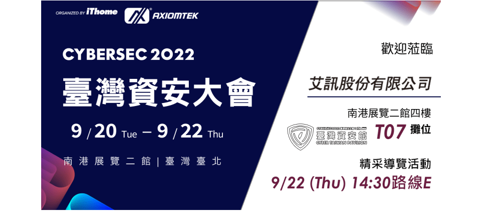 在三天展期當中,主辦單位更精心安排9/22 (四) 下午2:30導覽艾訊攤位,讓參觀者以最有效率的方式一次掌握最新的資安市場情報與產品技術趨勢,誠摯邀請大家共襄盛舉,擘畫更安全、更安心的數位未來!