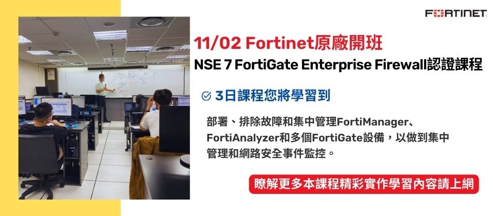接者詢問度超高的【NSE 7 FortiGate Enterprise Firewall認證課程】終於將在11/02開課!三天的課程中,您將學習來整合FortiManager、FortiAnalyzer和多個FortiGate設備,以做到集中管理和網路安全事件監控。詳細介紹https://supr.link/uq1kU