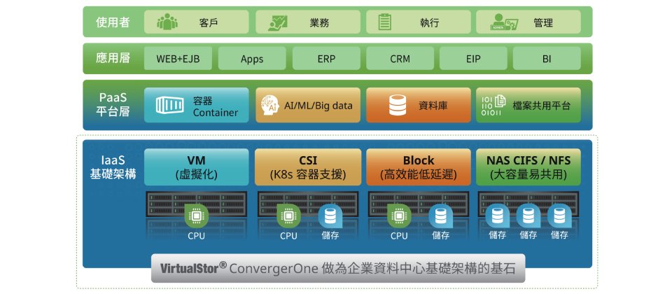VirtualStor ConvergerOne 2.1適用於伺服器工作負載、VDI桌面虛擬化、巨量資料處理、影像文檔等應用場景,也適用於對中小型資料中心有需求的企業,可簡化操作流程、改善儲存功能,並有效提升IT系統的效率與管理效能。超融合架構可協助企業視自身需求建構彈性規模的資料中心,避免不必要的系統支出,藉此降低成本。在資料安全方面,VirtualStor ConvergerOne 2.1提供資料保護與自我修復功能,支援企業關鍵應用所需的持續運作和容災能力。此外,VirtualStor ConvergerOne 2.1具備高可用能力與簡易維護特色,可透過擴充叢集節點來提升關鍵應用的運作性能、容量及系統可用性,順利跨出數位轉型的第一步,從而擴大企業在新世代競爭力。