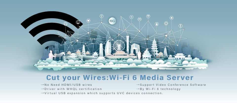 Wi-Fi 6 Media Server 無線模組採用業界最新的無線網路通訊標準Wi-Fi 6 (802.11ax),可帶來高速、低延遲雙向無線影像傳輸,延遲低於50ms,影像解析度最高支援1080p@60Hz,傳輸距離最遠可達20公尺。