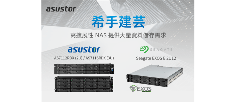 ASUSTOR® Inc. 為滿足巨量儲存時代,今日新增Seagate® Exos™ E 2U12 機架式機箱相容性*,與 ASUSTOR® 企業儲備雲系列 NAS AS7112RDX 或 AS7116RDX 搭配,共同提供用戶一個高容量、穩定性佳的儲存解決方案。