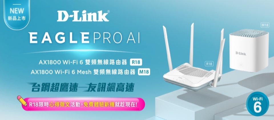 R18 AX1800 Wi-Fi 6雙頻無線路由器已經於全台正式販售,M18則預計5月接力登場,兩款單機建議售價分別為R18 $1,599 / M18 $2,399,M18另外同步推出雙入和三入組,給予消費者彈性的搭配選擇。D-Link友訊科技也與T1台鋼獵鷹籃球隊限時推出「台鋼超鷹速,友訊飆高速」R18心得徵文活動,即日起至2023/3/31前往網路表單完成報名,就有機會免費獲得R18新機乙台,同步分享您的使用心得文,讓R18用超鷹速帶大家展翅高飛!機會難得,歡迎民眾踴躍報名參加體驗。
