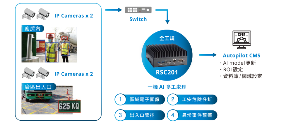 石化廠區幅員廣大,對於安全維護極為重視。過去廠區安全維護主要仰賴人工管理,即便後來開始安裝監控攝影機,仍須依賴人力監視畫面。如今為因應工廠智慧化的浪潮,廠區安全管理也逐漸朝向以智慧化設備監控取代人工監控的趨勢發展。因應市場需求,艾訊與基騰合力打造適用於智慧工廠的電子圍籬解決方案,選用工業級人工智慧平台RSC201透過AI多工處理,不僅於廠房內安裝IP Cameras偵測限制區域內是否有人員進出,並同時檢查工作人員衣著是否符合工安要求甚至在廠區出入口安裝IP Cameras,可以偵測車輛並進行車牌辨識以防止外車進入;當有人誤入廠房限制區域、或衣著與工安規格不符、又或者於廠區出入口有異常車輛進入等情況發生,系統將即時發出警示訊息,以維持廠區安全。