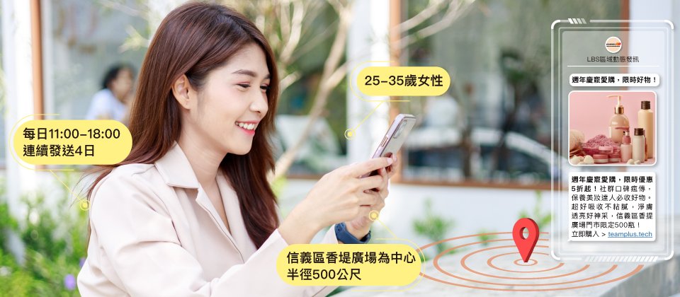 針對特定區域內目標客戶發送廣告,可依據居住地點靜態篩選,還能動態即時區域廣播的定位行銷服務。