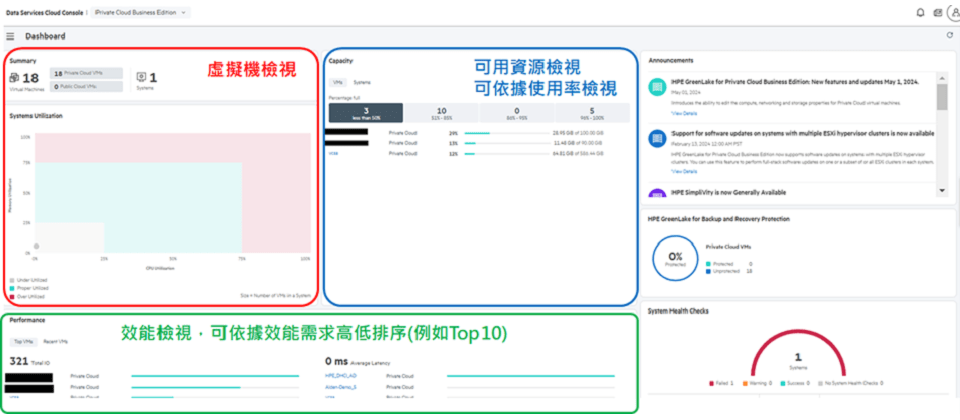 管理人員透過 PCBE 儀表版,可掌握雲端、地端環境中的虛擬機數量與資源配置狀況,滿足日常維運管理與資源效益最佳化的目的。