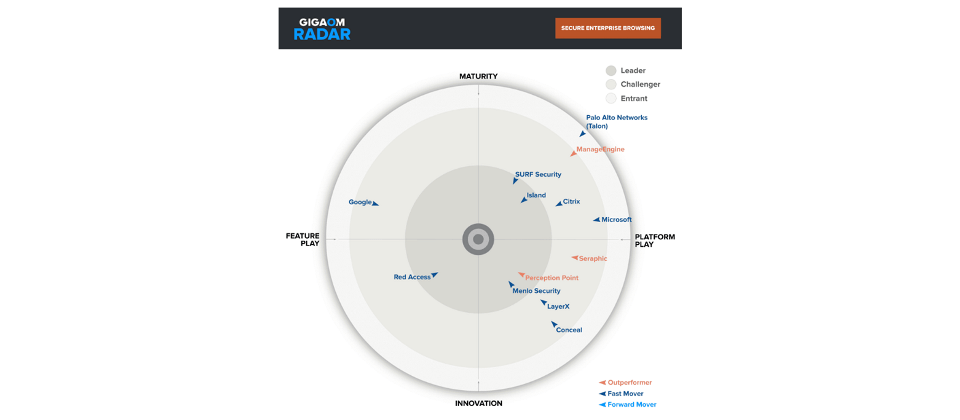 除此之外,全球知名的市場研調公司GigaOm,也在其8月份針對企業網頁安全(Secure Enterprise Browsing)所進行的GigaOm Radar研究報告,Perception Point Advanced Browser Security獲得platform/innovation領導廠商之評估決策標準最高總比分,成為該研究報告中之市場領導廠商。