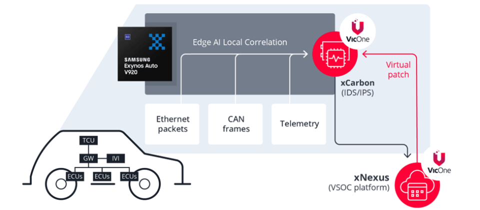 結合VicOne和三星半導體的汽車網路安全解決方案,是在三星半導體的Exynos Auto V920系統單晶片(SOC)上搭載VicOne xCarbon下一代入侵偵測和防禦系統 (IDPS)。