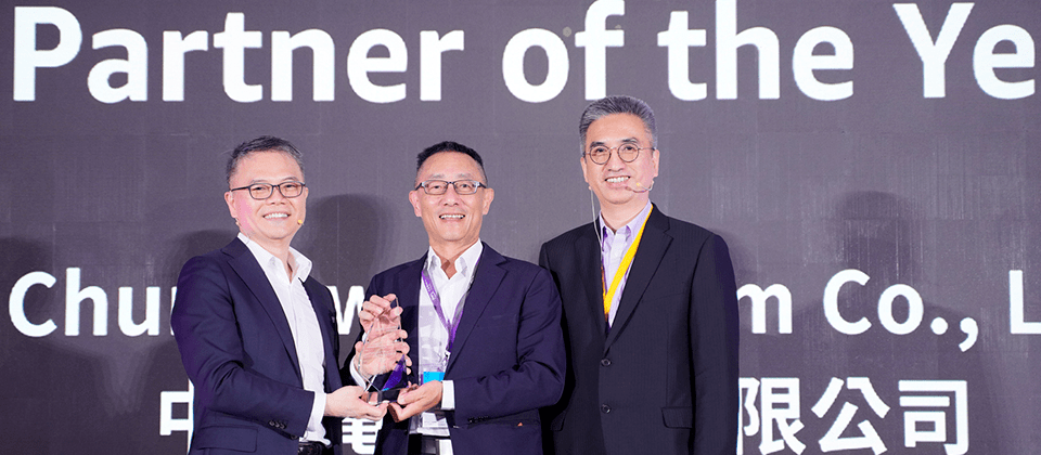 中華電信榮獲AWS Consulting Partner of the Year殊榮,中華電信企業客戶分司總經理張本元(中)代表受獎,與AWS台灣暨香港總經理王定愷(左)、AWS台灣合作夥伴事業部經理陳信宏(右)合影