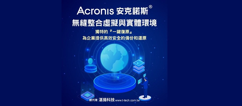 Acronis台灣總代理湛揚科技,深耕台灣市場已逾10年,憑藉專業技術團隊,為企業提供從售前規劃到售後支援的完整解決方案。湛揚科技協助MSP透過ACPC平台進行集中管理,資料保護、網路安全和端點管理的整合式服務,同時也為買斷制Acronis Cyber Backup的客戶提供穩定、可靠且全面的資料保護方案。今年2025是資料安全年,安克諾斯總代理湛揚科技年後將推出全新『有地有雲』方案,為企業打造極致資料備份與復原的體驗。歡迎上網申請30天免費試用服務,更多產品資訊請洽湛揚科技02-2515-1585或官網https://www.t-tech.com.tw 留言,我們將派專人與您聯絡。